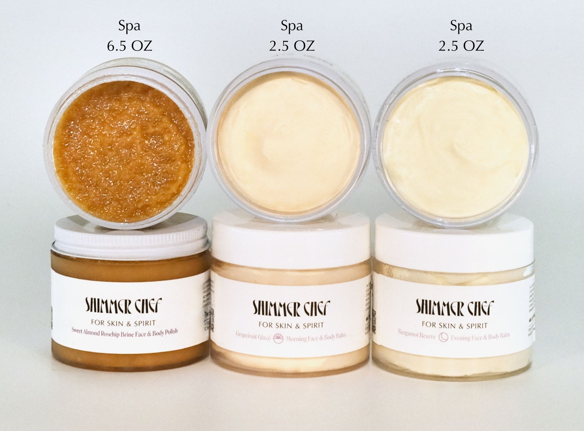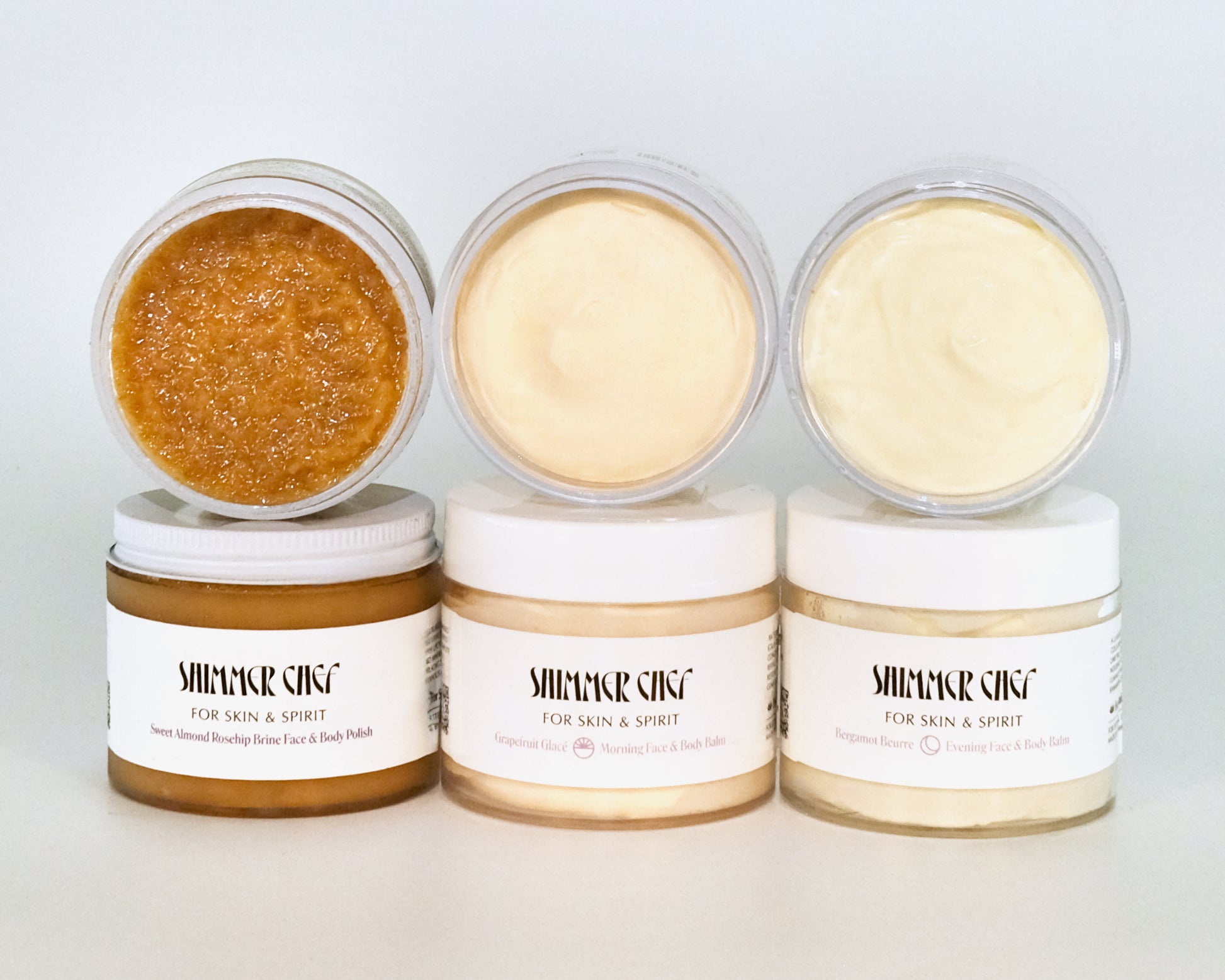 Organic papaya, grapefruit, orange, lemon, lime Vitamin C Infusion peels, organic Himalayan sea salt, organic maple sugar crystals, 100% dead sea salt, organic sweet almond oil, organic raw honey, organic rosehip oil, organic bergamot essential oil.